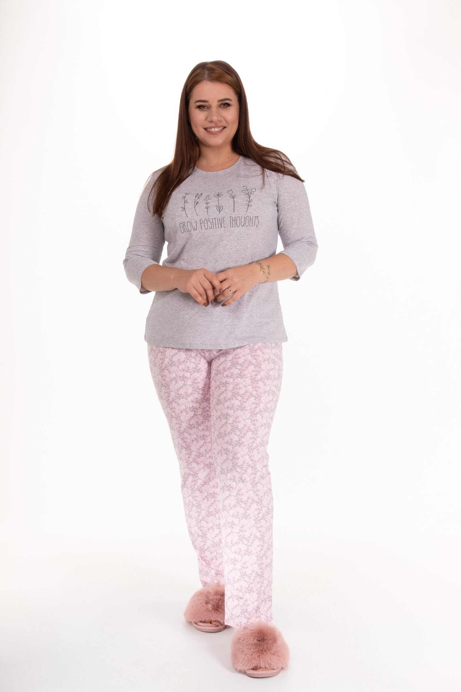 Šis rožinės-pilkos spalvos naktinės pižamos komplektas yra idealus pasirinkimas moteriai, vertinančiai kokybę, komfortą ir stilių. Švelnus audinys suteikia neprilygstamą patogumą, o elegantiškas dizainas leidžia jaustis ypatingai kiekvieną naktį. Spalvų derinys suteikia ramybės pojūtį, padedantį pasiekti kokybišką ir ramų miegą.