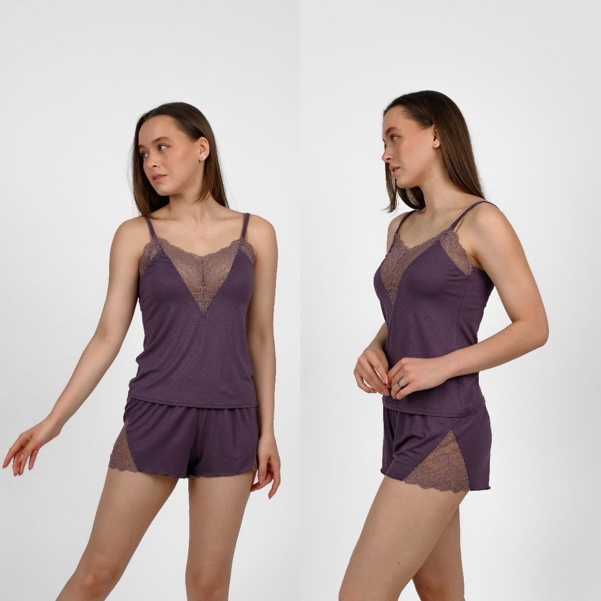 Nuostabi spalva: Violetinė spalva suteikia pižamai išskirtinumo ir elegancijos. Tai spalva, kuri simbolizuoja prabangą, ramybę ir moteriškumą, todėl jausitės ypatinga kiekvieną kartą apsivilkdama šią pižamą.